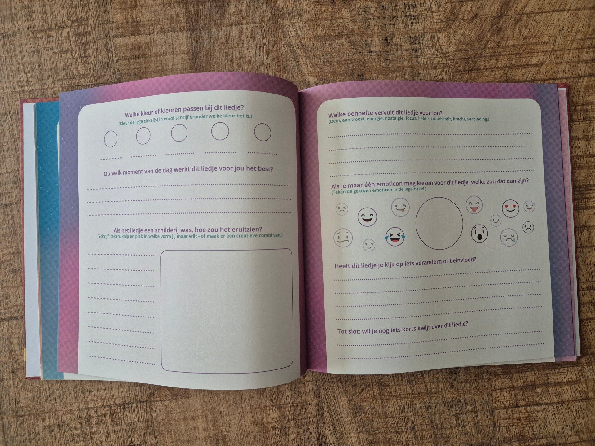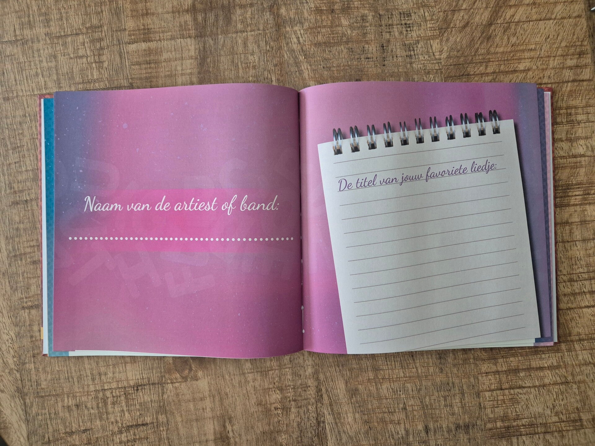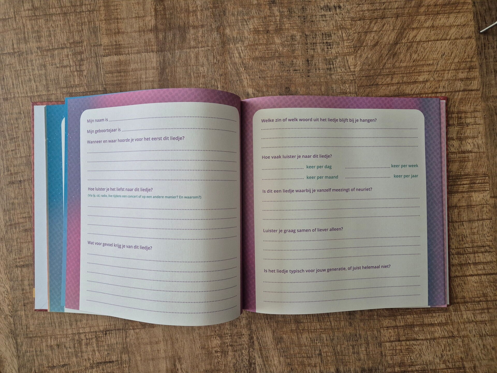 Tijdens het beantwoorden van de vragen onthul je nog niet om welk liedje, artiest of band het gaat. Zo blijft de lezer nieuwsgierig en kan er alvast geraden worden. Op de laatste twee pagina’s mag je het onthullen en is er ruimte om foto’s toe te voegen of iets in te plakken. Alles mag, niets hoeft.
